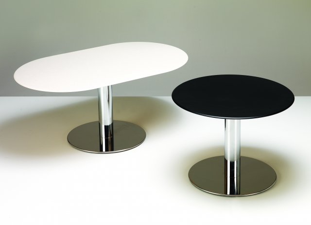 Stůl vhodný do kaváren a restaurací. Výška stolu 46,5cm, rám z nerezové oceli s povrchovou úpravou chrom, bílá, lesklá černá, satinovaná. Stolová deska ø 60cm z polymerického laminátu.